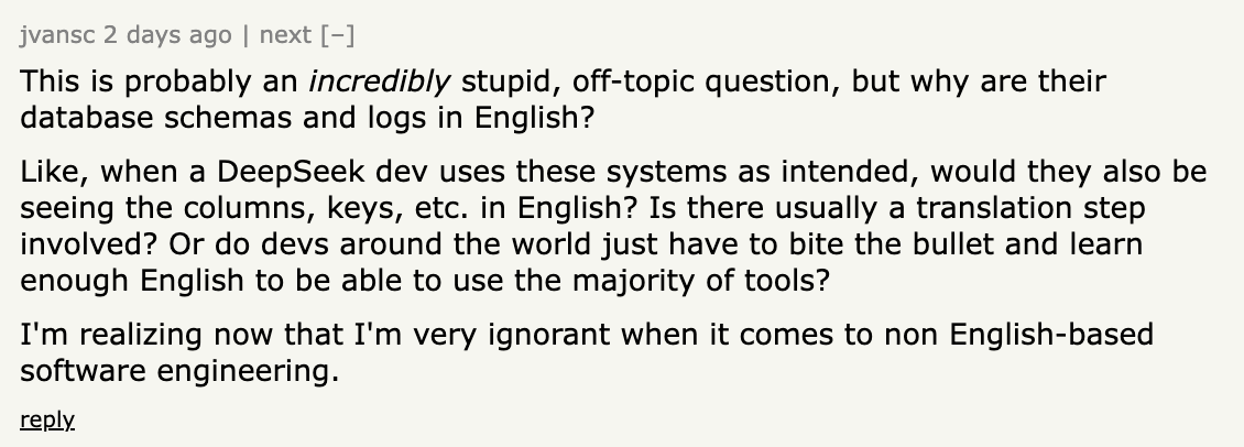 关于第一点,只能说average美国人对美国以外的世界了解还是有限。前几天HackerNews有一篇关于DeepSeek的一个Clickhouse数据库节点泄露的帖子,文章里有一些数据库schema的截图(比如log_stream, metrics_stream),下边有这么一条评论让我啼笑皆非。中国还是经济落后的第三世界啊,怎么可能会读写英语,怎么可能作出创新的大模型。